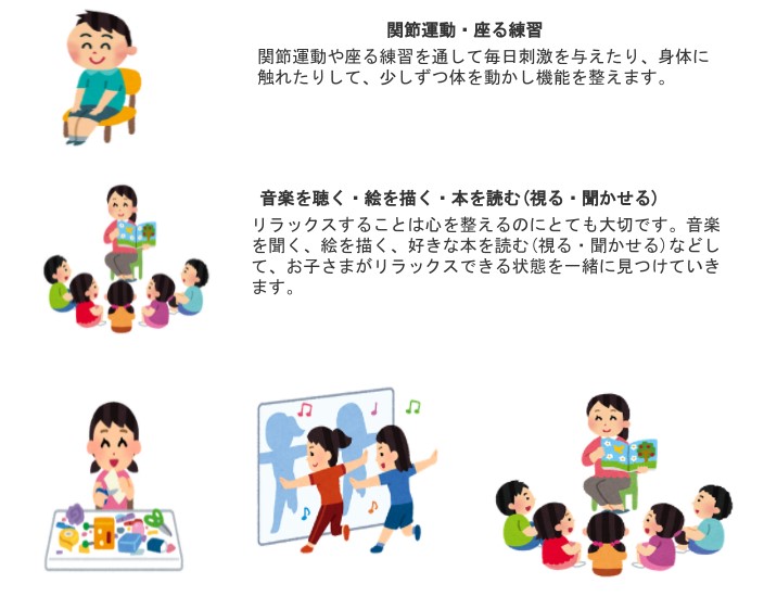 音楽を聞いたり、絵を描いたり、読み聞かせを聞いたり好きな本を読んだり(視る・聞かせる)することで、リラックスをして心と体の健康につなげていきます。 体験を何度も繰り返し、刺激をあたえて心と体を整えます